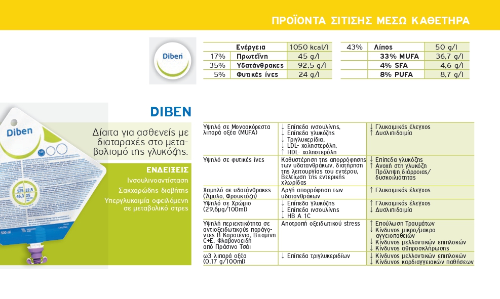 Το Diben της Fresenius Kabi είναι ένα διατροφικό συμπλήρωμα σε μορφή εντερικού διαλύματος για ασθενείς με διαταραχές στο μεταβολισμό της γλυκόζης.