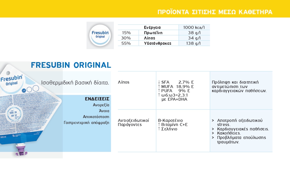 Το Fresubin Original της Fresenius Kabi είναι ένα Ισοθερμιδικό διατροφικό συμπλήρωμα σε μορφή εντερικού διαλύματος.